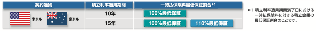 一時払保険料最低保証割合:ターゲット(100%、110%)/定期引出(105%) *