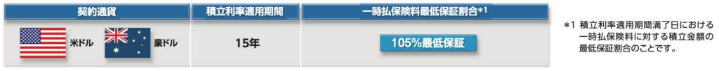 一時払外貨建(米ドルまたは豪ドル)終身保険です。特徴は