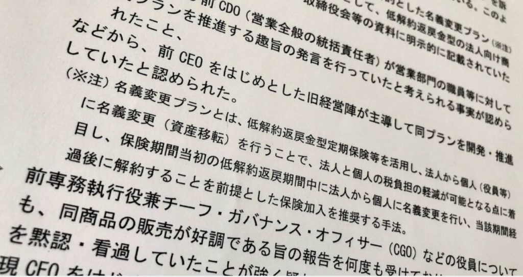 こうした悪しき企業風土を作り上げた元凶は、前CEOをはじめとした「旧経営陣」である。加えて、再発防止策は講じていたもののその後も企業風土を変えることができず、個人年金保険の名義変更プランの推進などを看過してきた現経営陣に対しても、厳しい指摘がなされている。