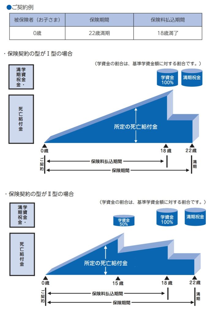 保険期間は2種類(20歳、22歳)から選択でき、保険料の払込期間はそれぞれ15歳と18歳になります。保険契約の型にはⅠ型とⅡ型があり、基準学資金の50%を15歳に受け取るかどうかの違いです。そして基準学資金の100%を18歳で受け取り、満期を迎えると満期金として基準学資金の100%または20%を受け取れます。
