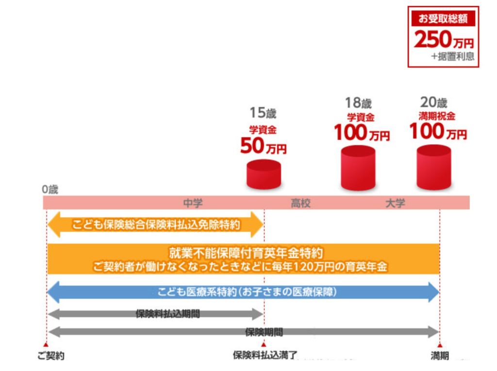 契約者(親)が死亡や高度障害になったときは、育英年金として基本育英年金額を保険期間満了まで受け取れます。