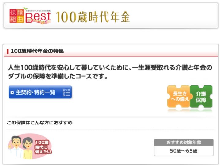 今回は太陽生命の年金商品「100歳時代年金」を解説します。こちらは『介護年金』と『終身年金』を組み合わせた商品です。