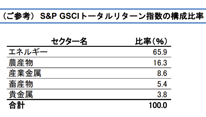 レポートではベンチマーク先のS&P GSCI Total Return Indexの投資先比率の情報のみでした。