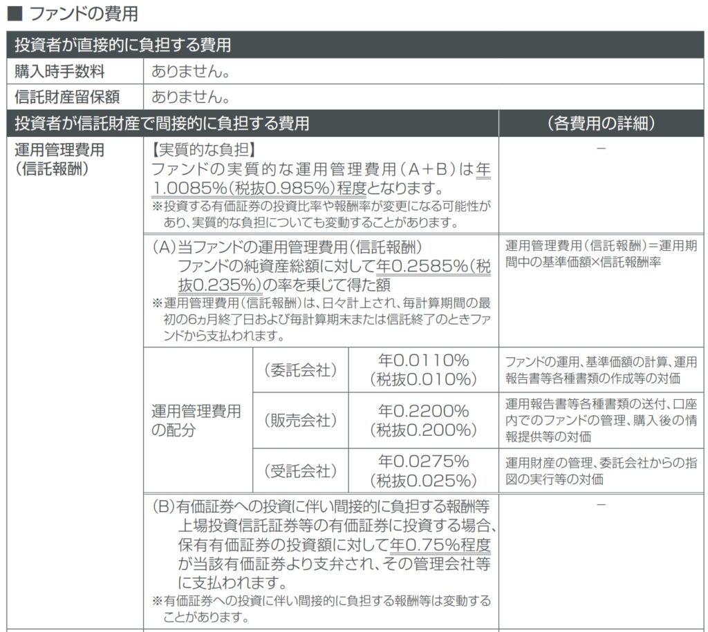 毎年の管理費用は1.0085%程度かかります。インデックスなのでこちらもシンプルですね。