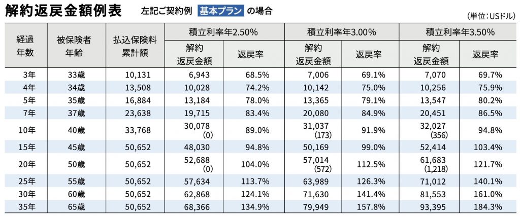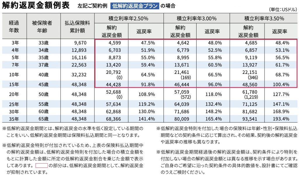 パンフレットに載っている基本プラン低解約返戻金プランを見ていきましょう。