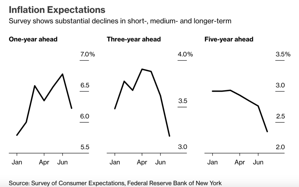 ニューヨーク連銀の調査では、米消費者の1年後、3年後、5年後のインフレ期待はいずれも急低下したことが明らかとのことですが、物価上昇率は緩和され、株価上昇につながるでしょうか。