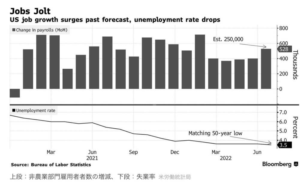 5日に7月の米雇用統計が発表されたましたが、非農業部門雇用者数は52.8万人増と、市場予想の2倍を超える増加となり、極めて好調な内容となりました。