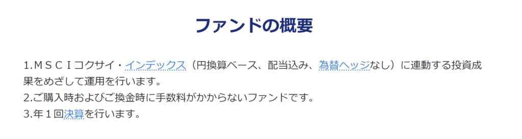 インデックス型なので説明もシンプルです。MSCIコクサイ・インデックス(円換算ベース、配当込み、為替ヘッジなし)をベンチマークとし連動するように設計されています。