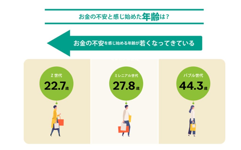 「お金の不安」を抱えている人を対象に、不安を抱え始めた年齢を尋ねたところ、若い世代ほど早い段階でお金の不安を感じていることがわかったそうです。