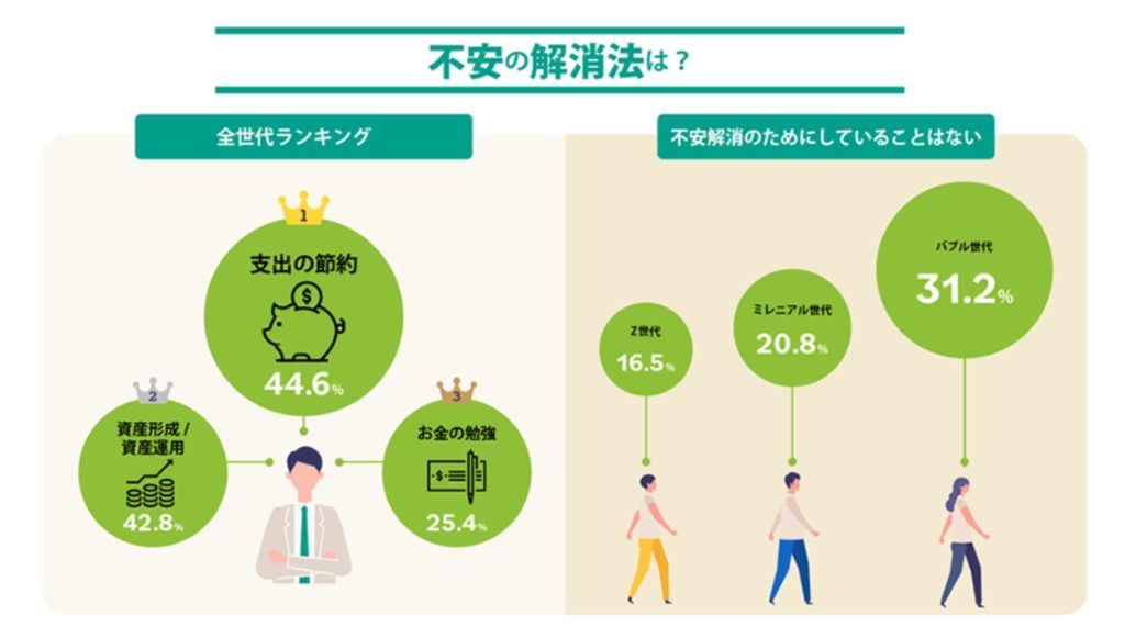 「お金の不安」を解消するために、全世代において「支出の節約」や「資産形成/資産運用」、「お金に関する勉強」をしているようですが、一部においては「何も行ってない」ようです。