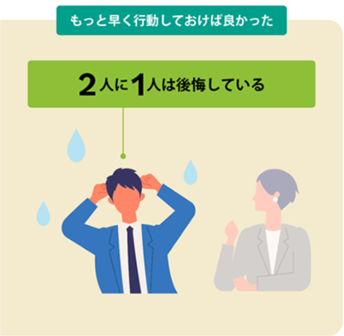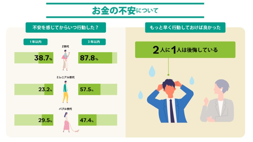 そこでは「お金の不安」に対する設問がいくつかあるですが、全世代の半数が「早い時期からお金の不安を解消するために行動すべきだった」と回答しています。