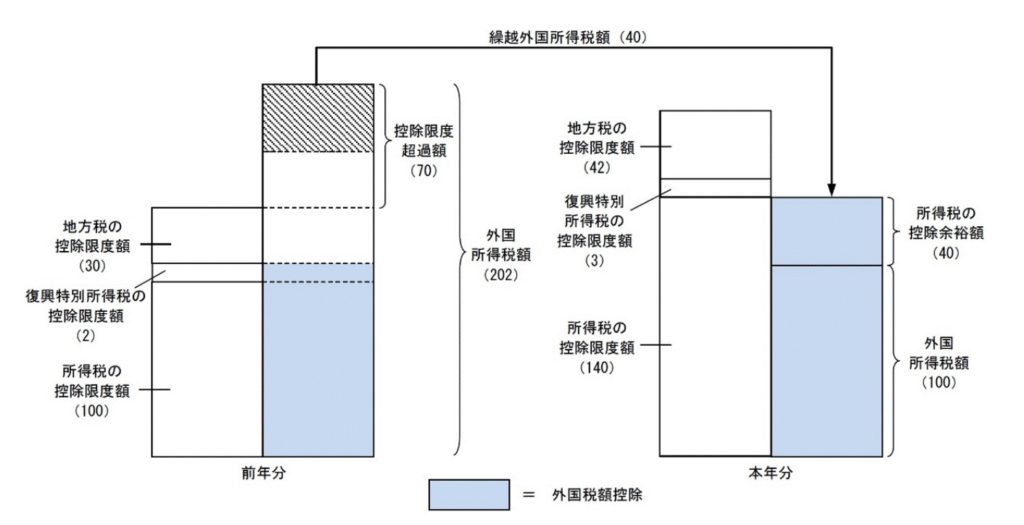 また、その年において納付する外国所得税額が控除限度額に満たない場合、前年以前3年内の各年において繰越外国所得税額があるときは、その年の控除余裕額の範囲内で控除することができます。