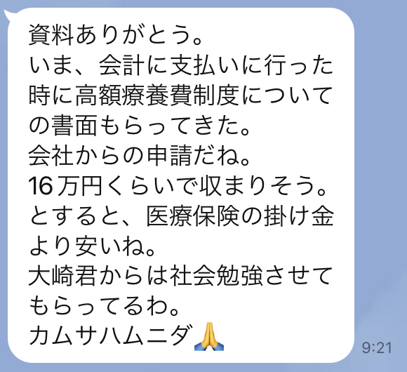 会計の際に医療機関の窓口で確認したところ、自己負担額は16万円くらいになりそうとのことです。