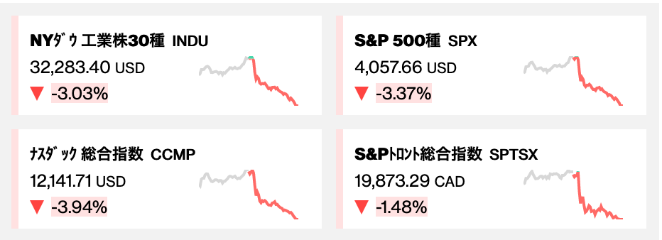 その発言を受けて株価は大きく下落し、米主要株式インデックスは軒並み3%以上の下落となりました。