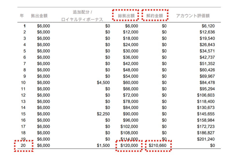 仮に35歳の方が55歳までの20年間、毎月USD500を拠出した場合、20年間の総拠出額はUSD120,000(赤枠で確認)。
