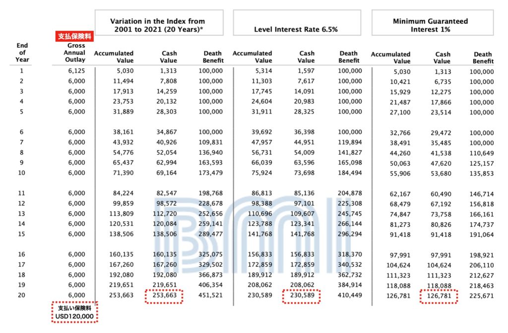 S&P 500 インデックスの過去20年の平均リターンで運用した場合、20年間の払込期間終了後における返戻金はUSD253,663(赤枠で確認)となりますので、元本に対して約211%との試算となります。