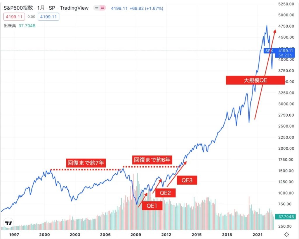 リーマンショックからの回復もQE3まで実施して、やっと金融危機前までの高値に回復していきましたし、コロナショックからの回復も異次元金融緩和によるところが大きいです。