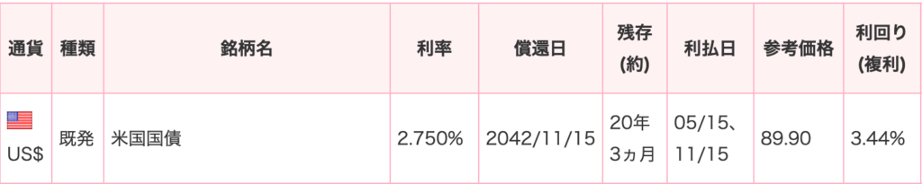 たとえば、2042/11/15に償還日を迎える米国債(額面10,000米ドル)を購入するとします。