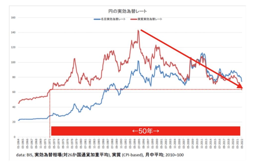 その「実質実効為替レート」では50年ぶりの低さまで日本円(通貨)の価値が下がっております。