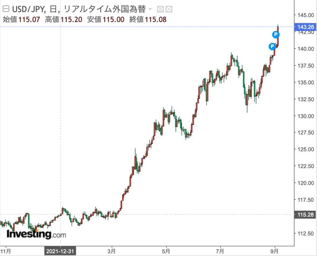 6日のニューヨーク外国為替市場では1米ドル=143円台まで急落し、1998年以来、およそ24年ぶりの円安水準を更新しましたが、今現在も1ドル=143円台を維持しております。