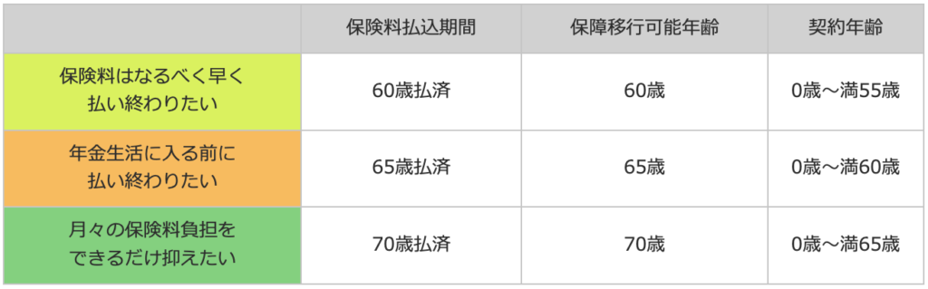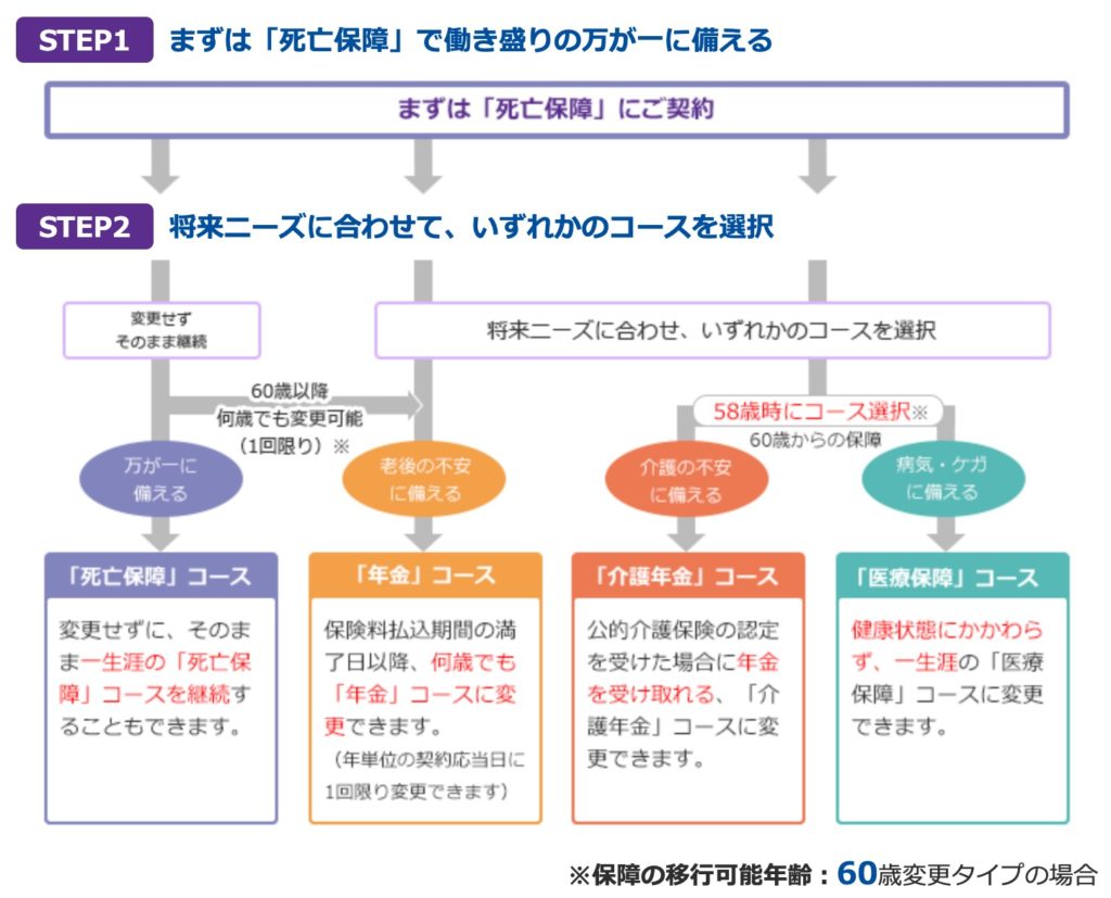 ということです。契約した時はただの死亡保障しかありませんが、払込終了後に4種類(死亡保障、年金、介護年金、医療保障)のコースから保障内容を選択できます(それぞれ組み合わせることも可能)。
