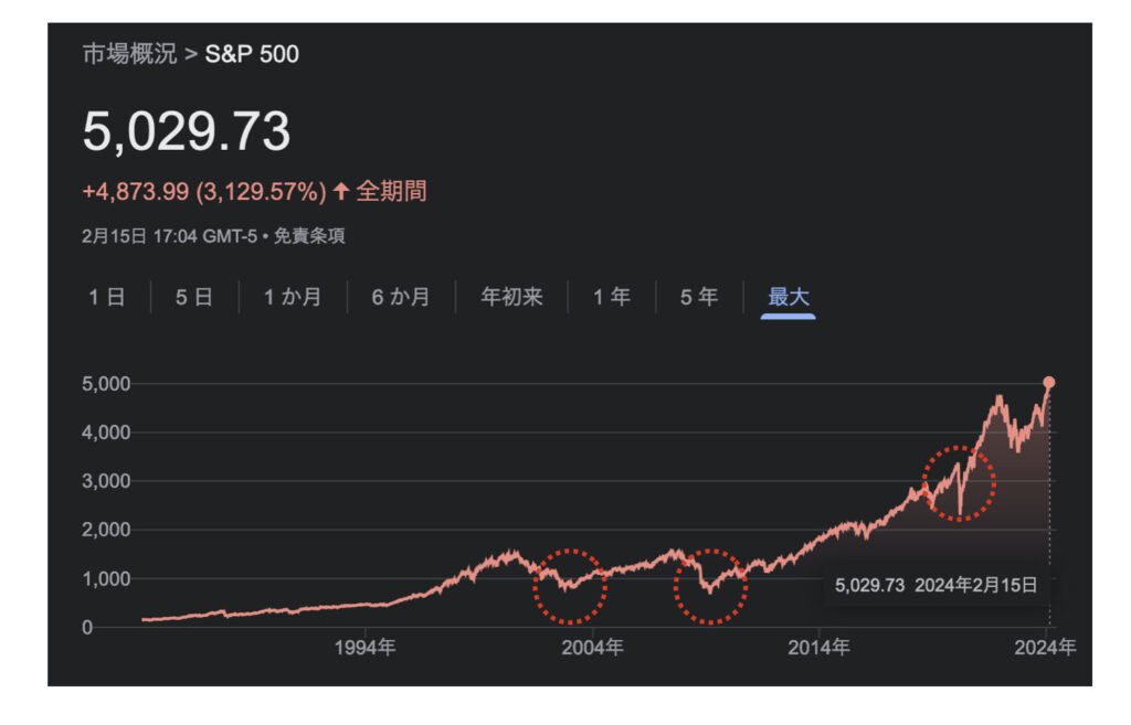 以下はS&P500インデックスの株価推移ですが、ITバブル崩壊やリーマンショック、そしてコロナショックの際は株価は大きく下落しています。