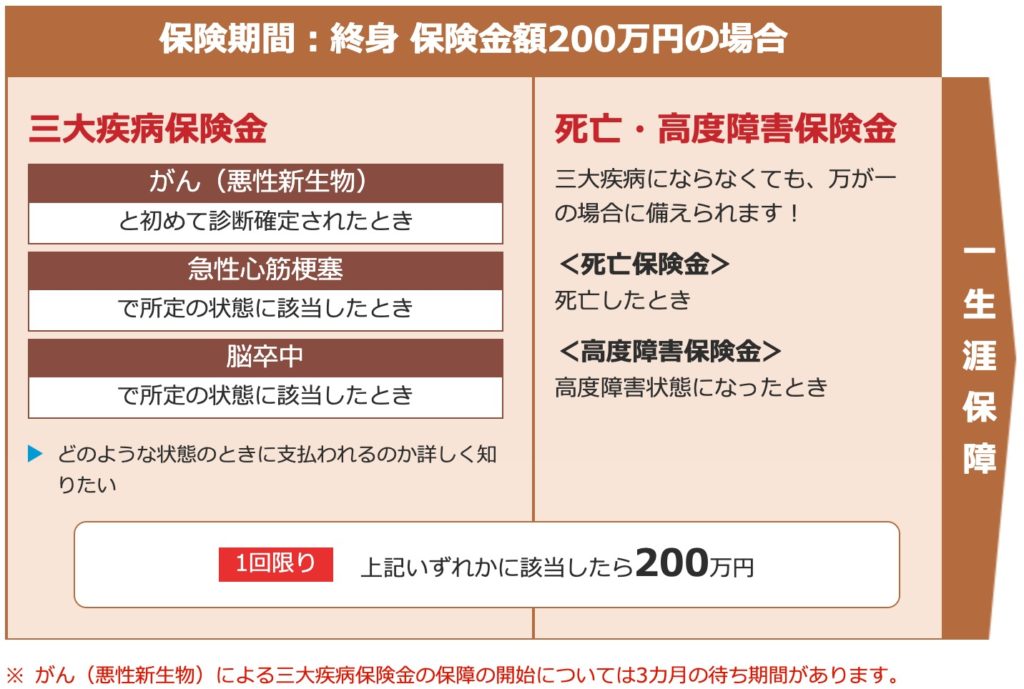 死亡や高度障害だけでなく三大疾病の保障が付いている保険です。三大疾病になって保険金を受け取ると契約は終了になります。他社でもこの手の商品は出しており、その中でも断トツでコスパが悪いです。