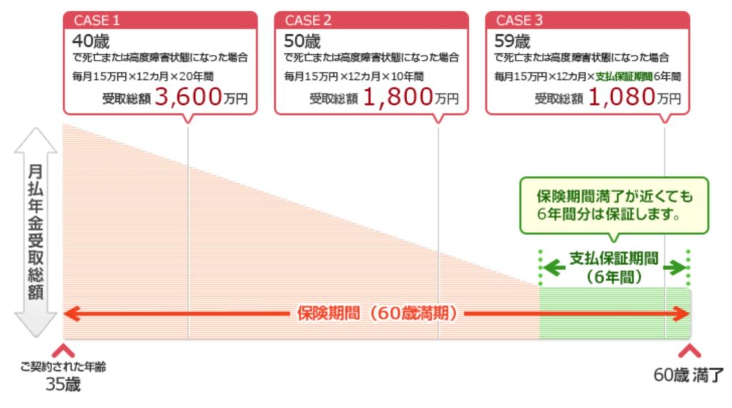 死亡や高度障害時には設定した年金月額の保険金を保険期間が終了するまで受け取ることができます。保険金は年金形式で受け取っていきますが、保険期間は決まっているので、受け取れる保険金の累計は毎月少なくなっていきます。ただ必要な死亡保障金額は年齢を重ねる毎に少なくなっていくので、無駄がなくとても合理的な保障内容といえます。