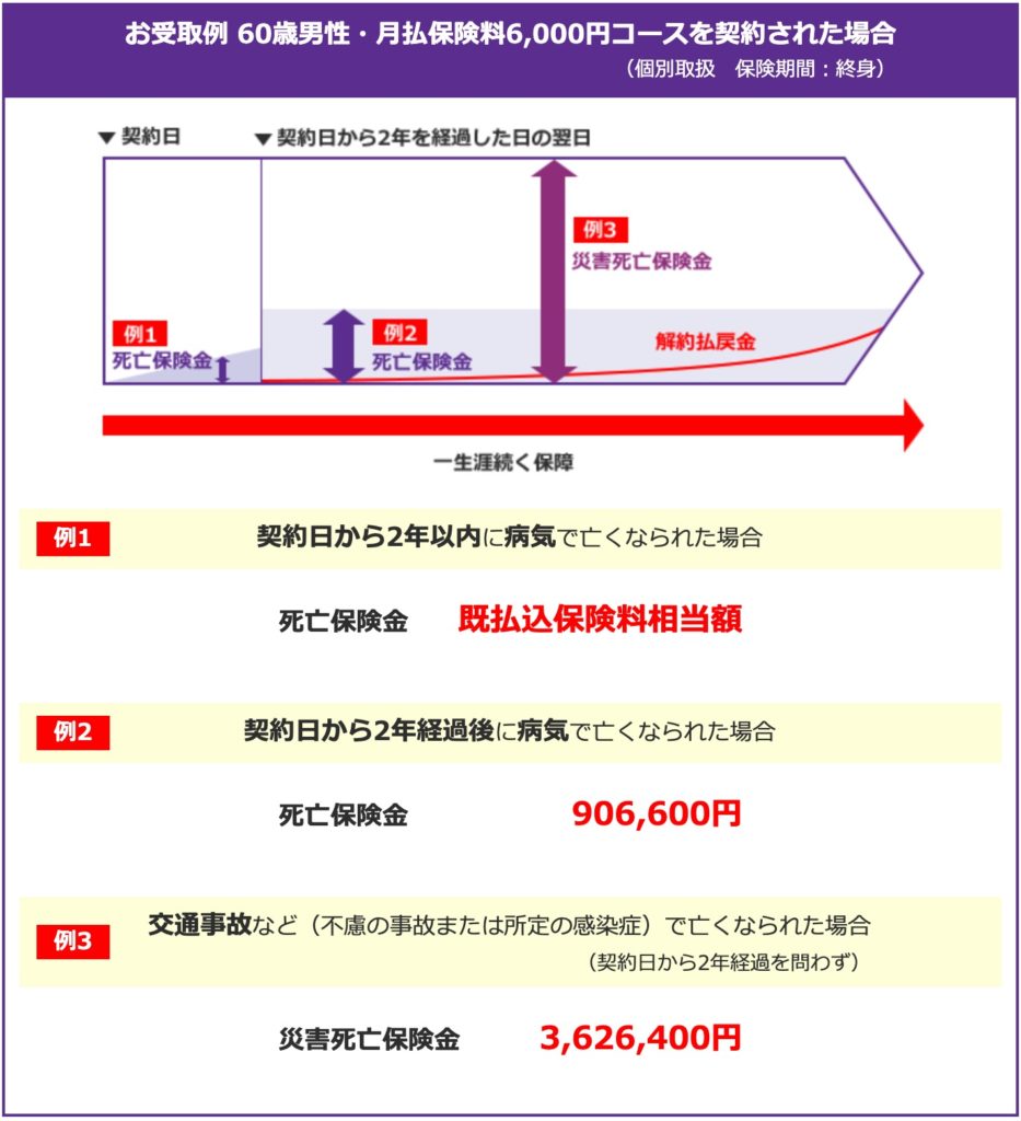 被保険者が死亡した時に死亡保険金額を受け取れます。ただし契約から2年以内に病気で亡くなられた場合は、保険料相当額しか支払われません。災害死亡の場合は、死亡保険金額の4倍が支払われます(2年以内でも)。