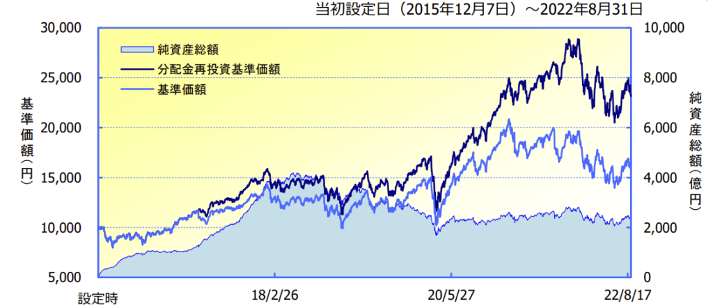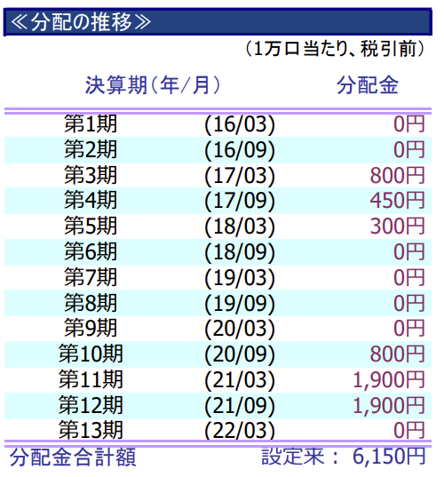 分配金は2021年に過去最高の分配金が出ましたが、株式市場が回復してこないと今後分配金は難しいでしょう。