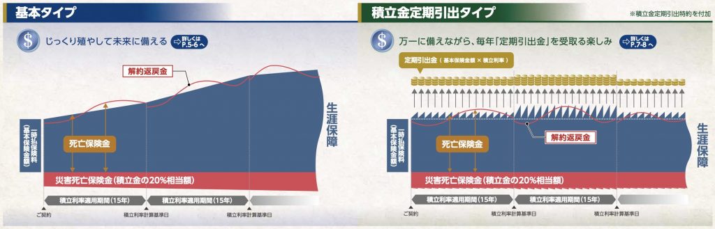 基本タイプは複利運用ができ、定期引出タイプは金利を毎年受け取っていく単利運用になります。