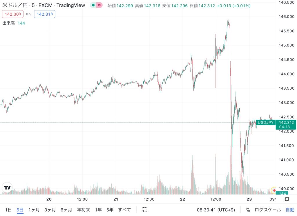 この黒田総裁の発言を受けて、外国為替市場では1ドル=145円90銭を付けたのですが、その後、政府が円買いドル売り介入を実施したというわけですね。