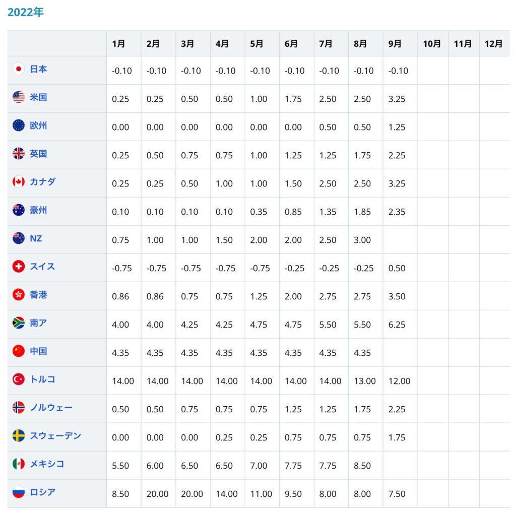 この話はニュースでもよく話題になっているので、皆さんご存知だと思いますが、2022年に入り各国利上げをしております(下記画像参照)。