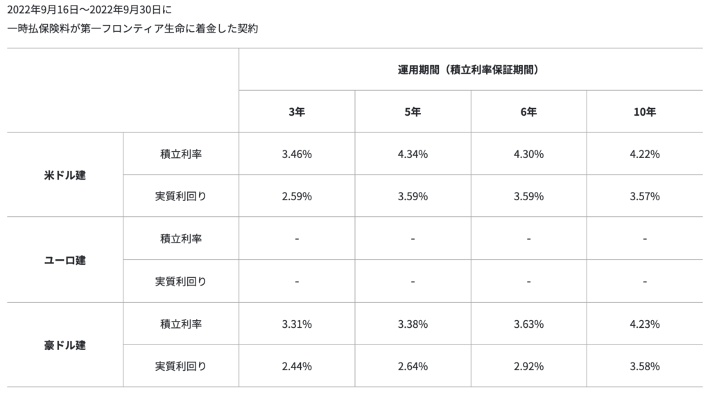 他にもメットライフ生命の「サニーガーデンEX」で積立利率が4.13%(2022年9月16日〜30日まで)。