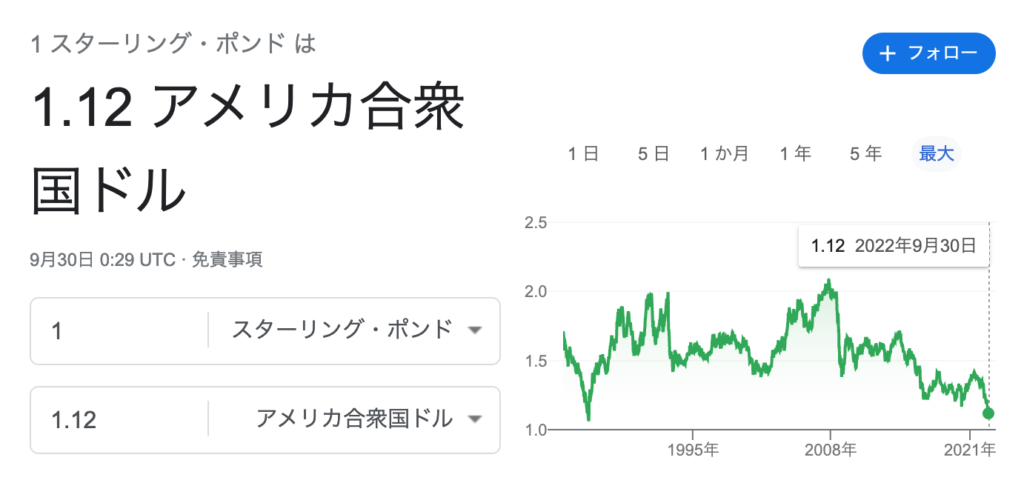 昨年から下落基調ではありましたが、9月27日時点の終値では1ポンド=1.0733ドルとポンドはさらに下落。現在は1ポンド=1.12ドル 近辺まで戻しておりますが、それでも1985年2月の最安値に近い金額です。