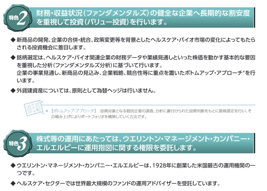 ヘルスケアセクターで世界最大規模のファンドの運用アドバイザーをしている、ウエリントンへ運用権限を委託しているのがポイントですね。