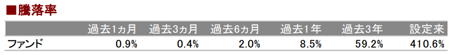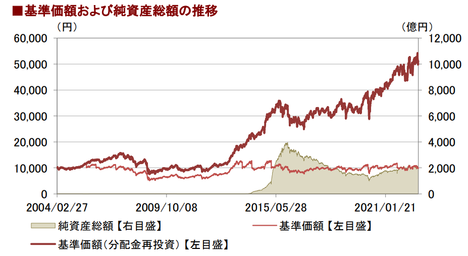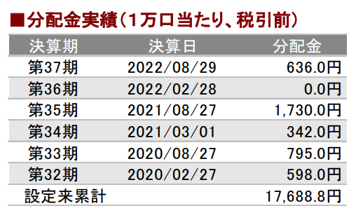 この1年で+8.5%、3年で+59.2%のプラスになります。基準価額は10000円前後でずっと推移していますが、分配金再投資後の基準価額推移を見ると右肩上がりになっています。直近は分配金が出なかった決算もあったようですが、このセクターが景気の影響を受けにくい為、分配金が安定して配当されていると見るべきですね。
