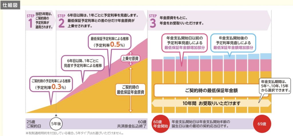円建で予定利率変動型の個人年金保険です。年金開始年齢と払込終了年齢をそれぞれ設定できるので、早目に払込を終えて寝かしておくと受け取れる年金額を増やすこともできます。他社でも同じようなことができる商品はありますので、これと言って特徴とも言えません。もちろん、利率はめちゃくちゃ低いです。