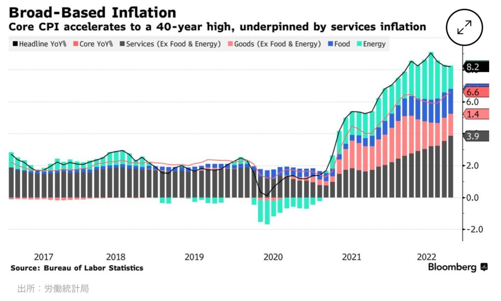 変動の大きい食品とエネルギーを除いたコアCPIは前年同月比6.6%上昇となり、こちらも市場予想の6.5%を上回りましたが、これは1982年8月以来、40年ぶりの高い伸びとなります。