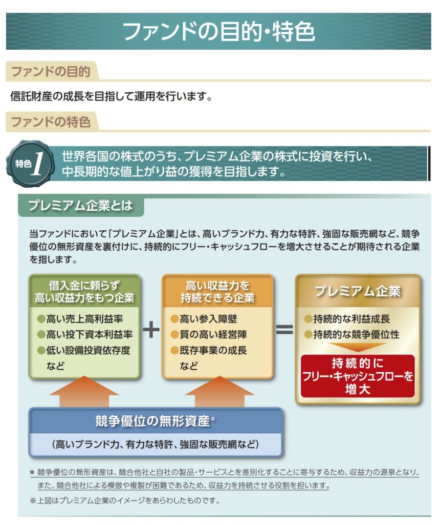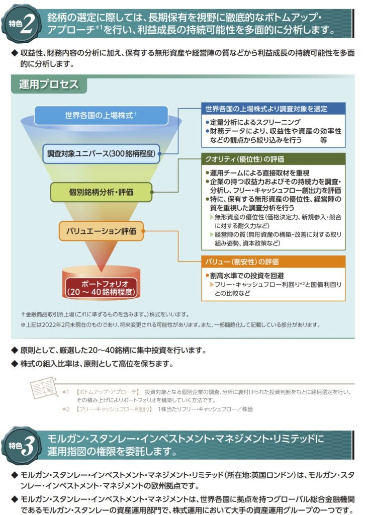 プレミアム企業の解説がポイントですね。あとは名称の通りモルガン・スタンレーに運用権限を委託しています。