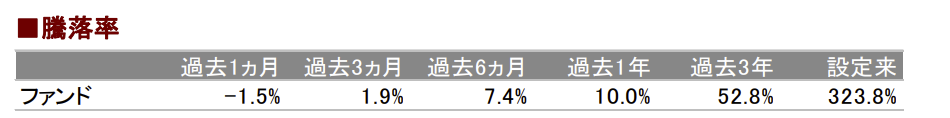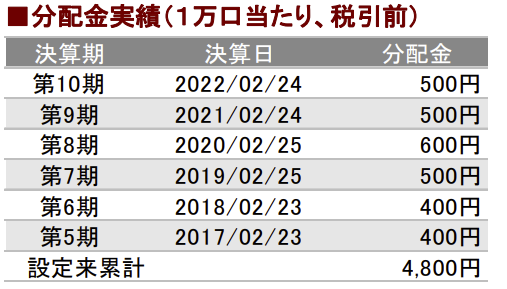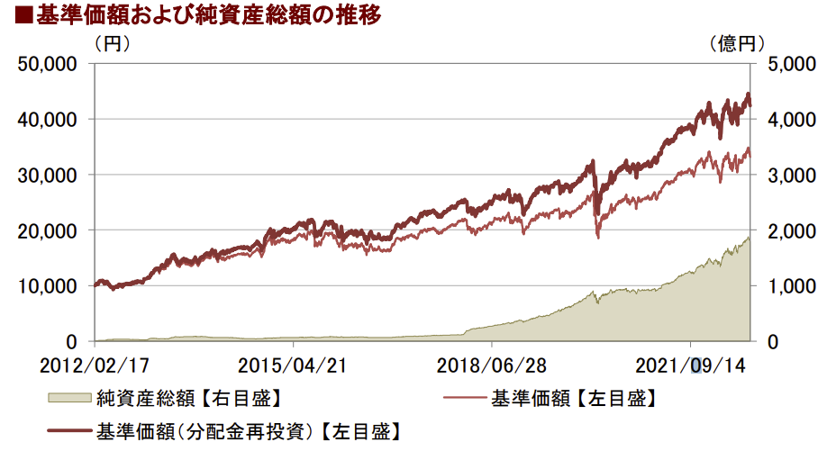 こちらのファンドは為替ヘッジあり/なしがありますが、今回は為替ヘッジなしのデータで解説します。この1年で+10.0%、3年で+52.8%のプラスになります。分配金は決算毎に400~600円前後出ており、安定しています。