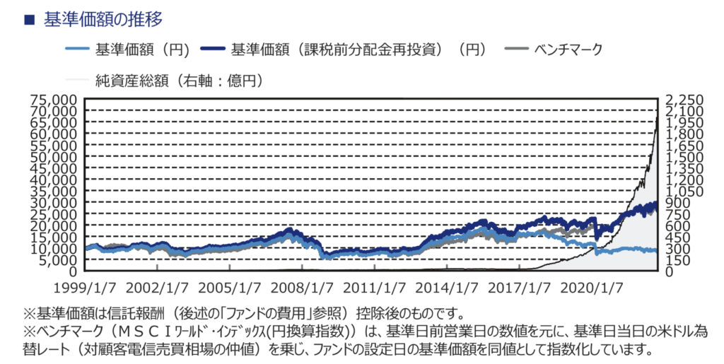 このファンドには為替ヘッジあり・なしが選べますが、人気のある「為替ヘッジなし」で解説します。為替ヘッジなしということは、投資通貨である米ドルやユーロなど外貨の影響を受け、円換算している基準価額には円安下の為替差益が含まれています。