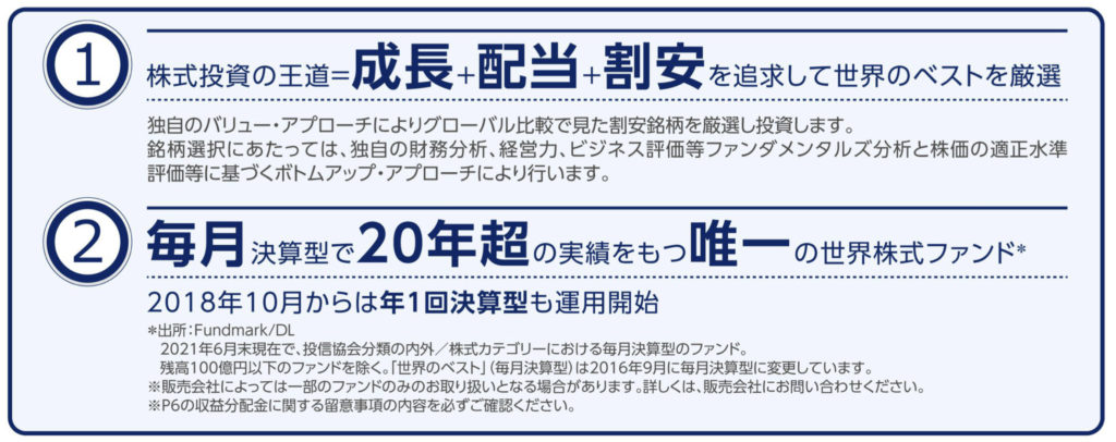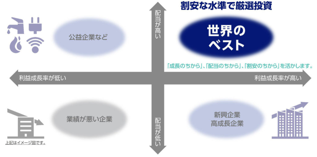 投資先が世界株というと、恐ろしくたくさんの銘柄から選定しないといけないですよね。ということはどんな基準で選定するのか?がとても重要になります。その説明がこちら。