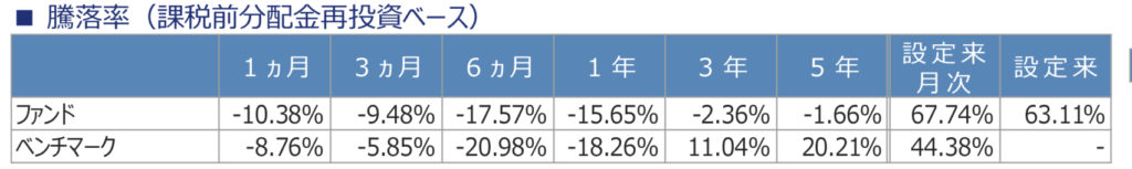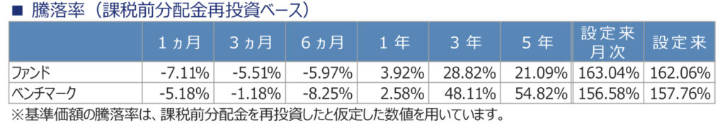 直近5年間でファンドは+21.09%。一方ベンチマークは+54.82%ですから、ひどい負け方です。。余計な選定などせず、インデックスに投資しておけばよかったということになります。
