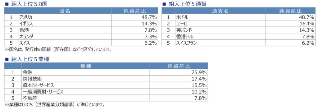 国ごとに見てみると米株が半分、あとはパラパラと分散しているようです。永遠割安株の金融株を入れてる時点で、成長株じゃないよね?って思ってしまいます。