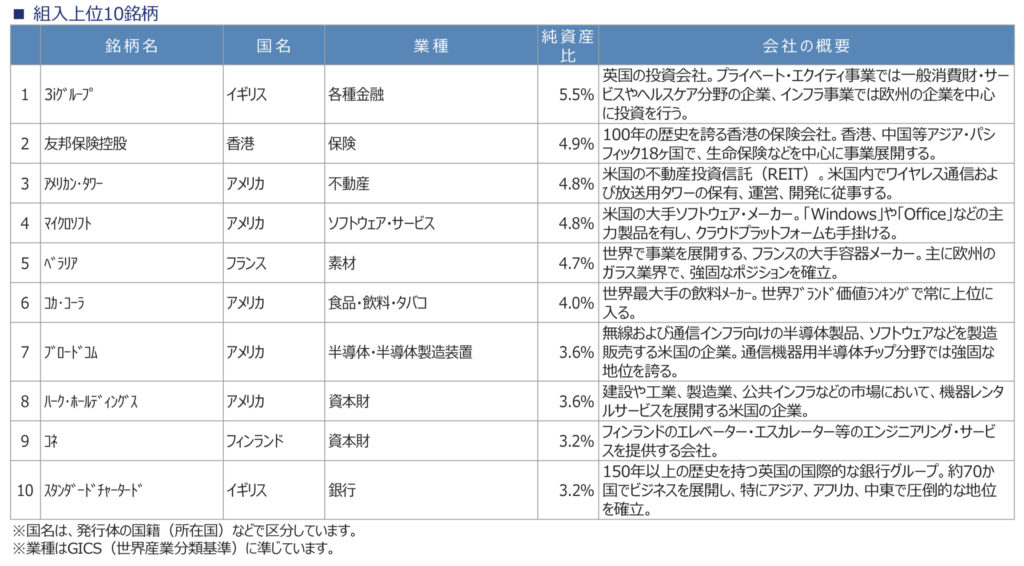 組入上位10銘柄を見てどう感じますか?私はやはりとてもコンサバな印象が強く、成長というテーマからは遠いと思います。そもそも成長株(グロース)と割安株(バリュー)って相反するもので、それを同じ基準の中で選定するってこと自体が、ファンドとして大丈夫か?って思います。