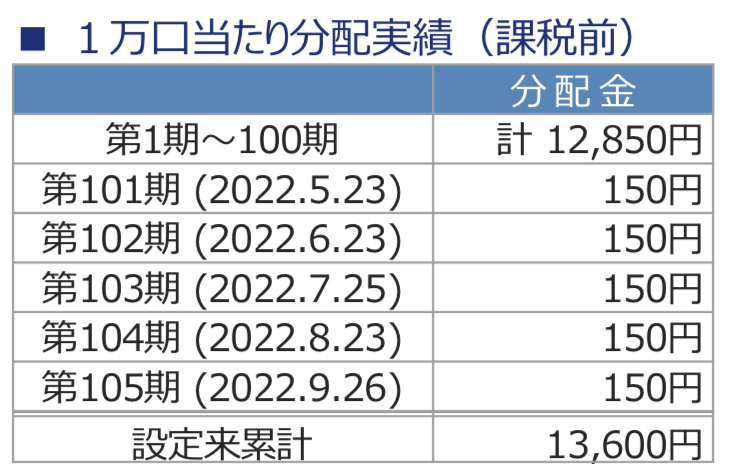 毎月150円出すということは、年間で1800円。現在(2022.10.18)、8000円くらいの基準価額ですから、2.25%の配当性向です。これまで13年間で13,600円出してきたそうです。良かったですね(皮肉)。