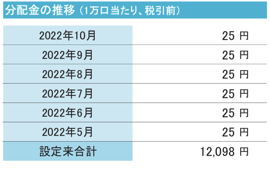 なお皆さんが見ている基準価額は分配金を出した後の基準価額です。これが2022.10.19現在、2000円になってます。はい、10,000円スタートですから、1/5です。