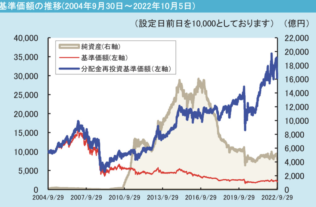 2004年から18年で10,000円の基準価額が34,000円(分配金込み)になっているので、約3.4倍になっています。これだけ見ると良いファンドですよね。