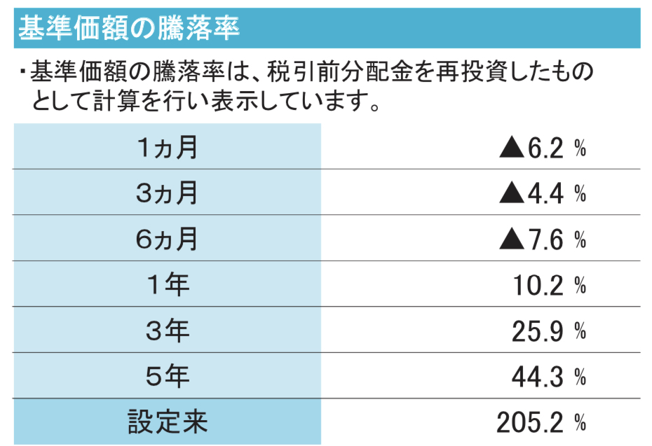 最近の成績を見てみると、5年で+44.3%ですから、それほど良いパフォーマンスは出せていません。ベンチマークと比較しても、明らかにここでも負けていますね。